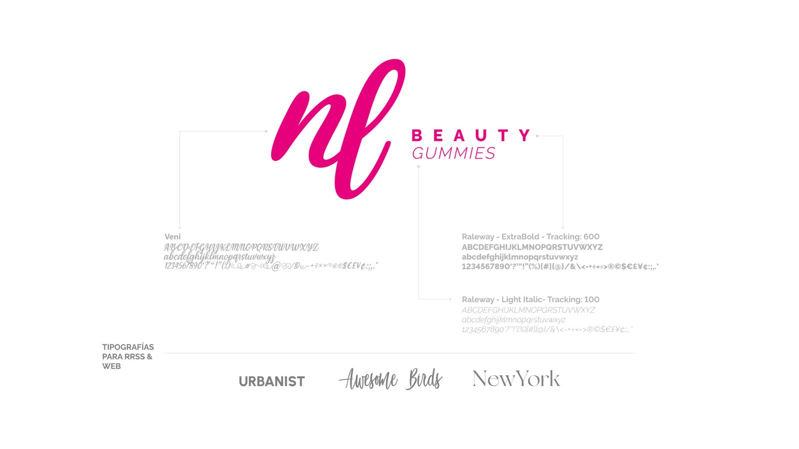 Identidad Visual: Sistema de logotipos escalables con variaciones específicas para cada línea de productos (Gummies, Nutrition, Cosmetology).