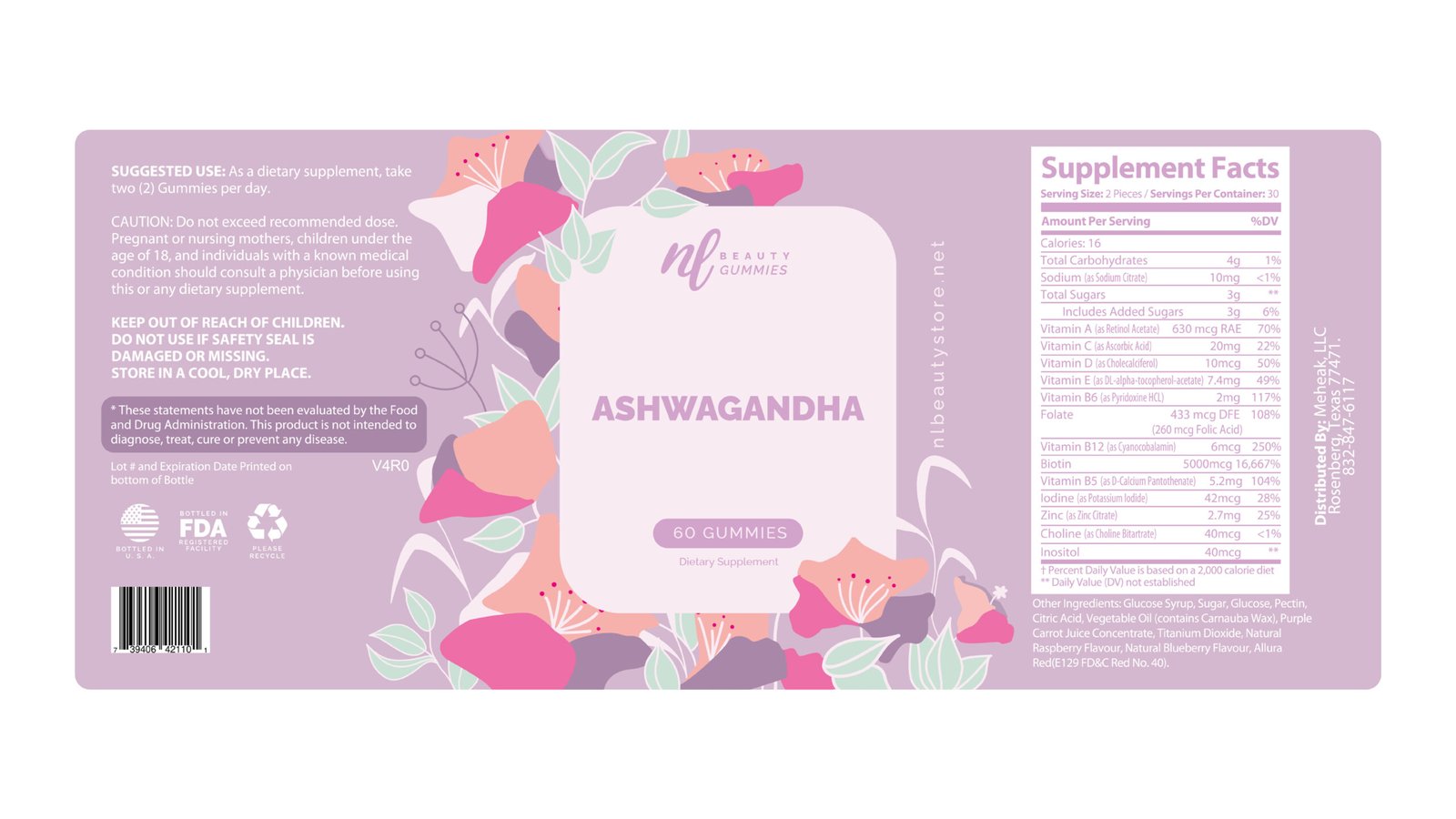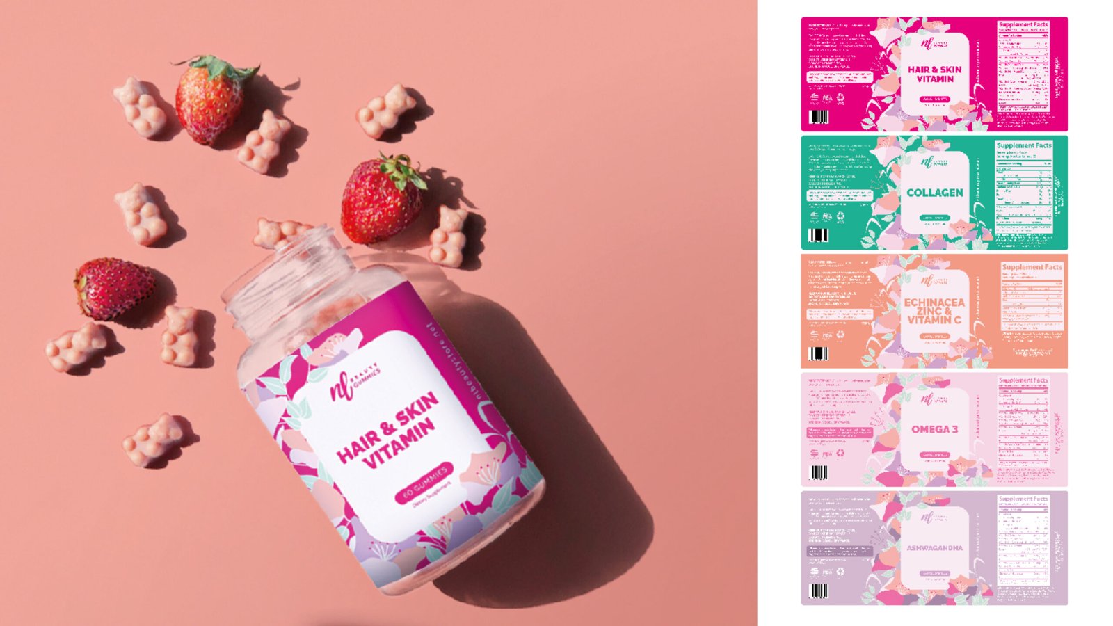 Diseño de Empaque (Packaging): Etiquetas estratégicas para toda la línea de gomitas (Ashwagandha, Colágeno, Biotina), integrando la información nutricional de forma clara y atractiva.
